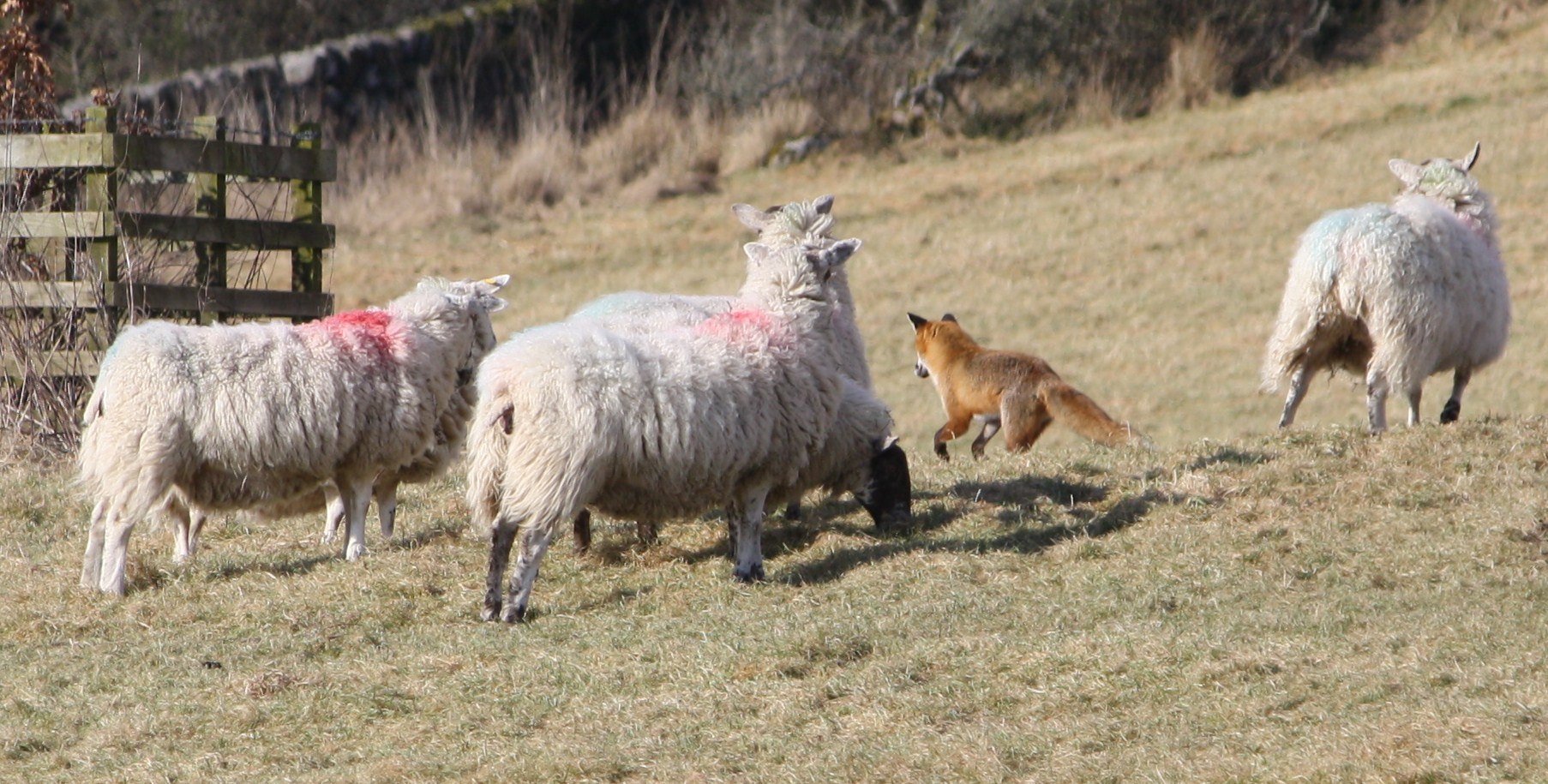 Walking back to the car after an excursion to inspect a bucket of ash tree saplings on the hill, my girlfriend and I saw a big dog fox trotting through the rushes, apparently without a care in the world. Stupidly, I was unarmed, but my girlfriend began to photograph him through a long lens. He sauntered towards a small group of sheep in a purposeless attempt to push them out of the way, but was somewhat horrified to find that they stood their ground. The foremost sheep stamped her foot and the fox stopped. He took another step towards her, but she stamped again and began to jog towards him. Others joined her, and in a second it was all over. The fox had been beaten and he lolloped away into a thick patch of rushes.
