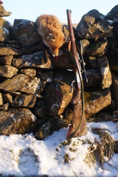 It was a hard, crispy morning on the Chayne, and my footsteps crunched in the solid drifts of snow . I arrived at six fifteen, just as the sun was glowing over the distant Solway, and I set off up the hill to the woodcock strip where I found the remains of the snipe on Saturday. There was no wind at all, and I quickly gave up all hope of surprising anything on the farm. As the sun slipped over the shoulder of Criffel, an orange beam of light lit up the trees ahead and I stopped to scan along the boundary with the telescopic sight. A strange beige shape made me double check. It looked vaguely like a roe deer, but as I swung the rifle back to my shoulder, I noticed that it was only a swirl of dead grass. I almost ignored it altogether, but the first rays of sunlight suddenly picked up something else. It was a fox, and it emerged into the fresh glow to sit down without a care in the world.