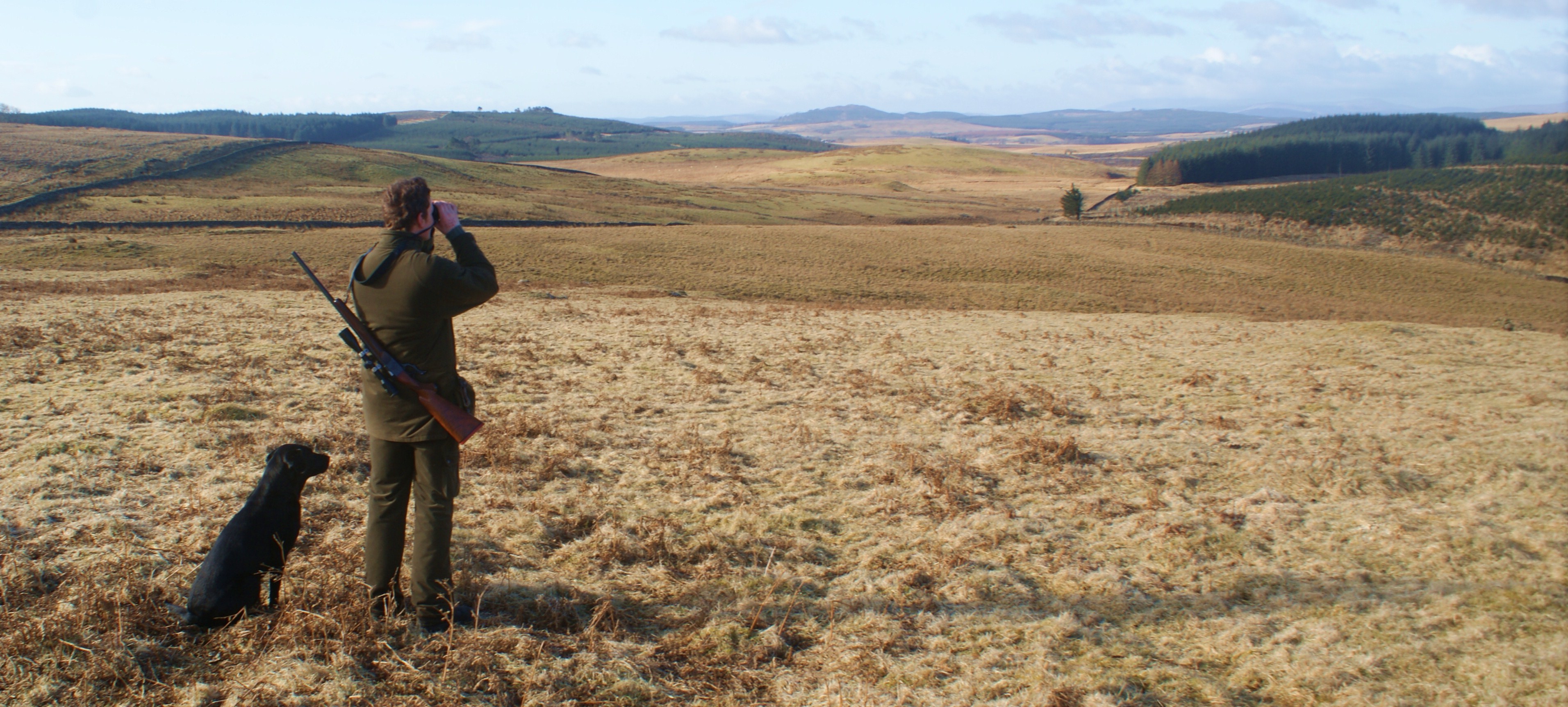 Reaching the summit of the farm’s highest hill, we changed direction and worked down a corrie on its far side towards the boundary fence, hoping to intercept anything sliding out of the tussocky grass and back into the forestry. Moving as silently as we could through the dry moss, Richard’s dog Bliss began to wag her tail frantically, sniffing the breeze. Two hundred yards ahead, a roe doe stood up from a collapsed stand of bracken. She looked very small through the telescopic sight, and taking advantage of the presence of my stalking mentor, I asked Richard if she was in range. As I asked, a yearling doe stood up behind its mother and they turned their ears in the sunshine. They must have heard us, because in the instant that it took for Richard to tell me that they were in range and that I should take the yearling, we had been rumbled. The two deer sprung into the air, flicking their heels in the sunlight and gliding silently over the boundary fence and into the pines.