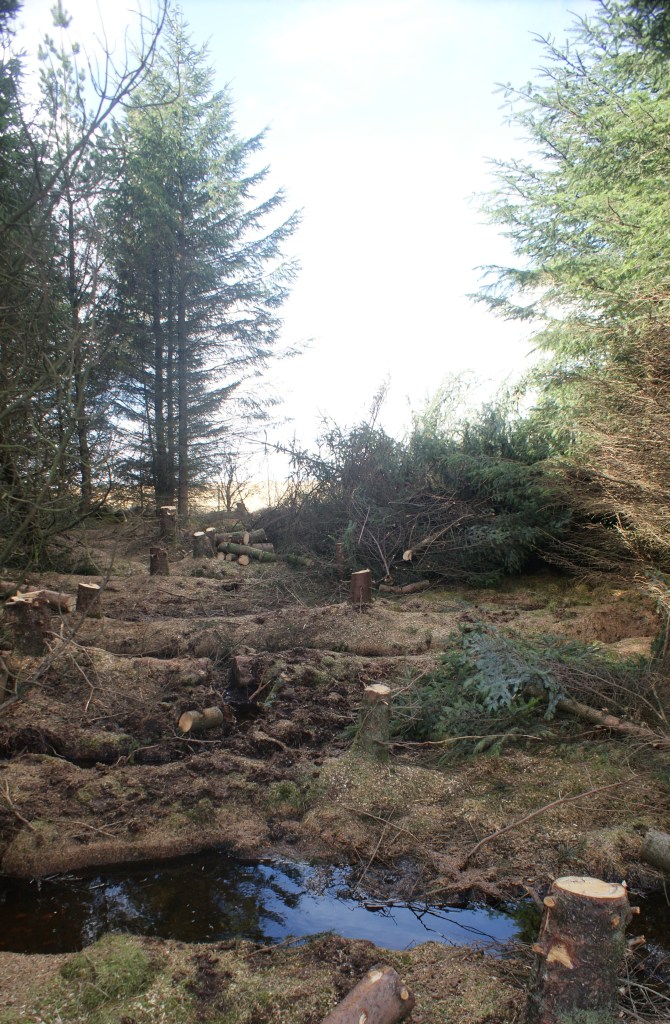 Willow is the obvious choice for a wet area of moorland, and cutting off thirty budding whips from a nearby willow tree, I jammed them into the ground at various intervals all around the brash heaps and into the soil beneath the thick moss on the westerly boundary of the strip. I am assured that willow is sufficiently robust to handle this mistreatment, and cuttings will often put roots down and grow happily as if nothing had ever happened. I don’t expect thirty trees to appear, but a tangle of whispy willow scrub would suit my purposes perfectly. After a few years, scrub should start to take over, shedding leaves which will rot down into worm-rich compost: perfect for woodcock.