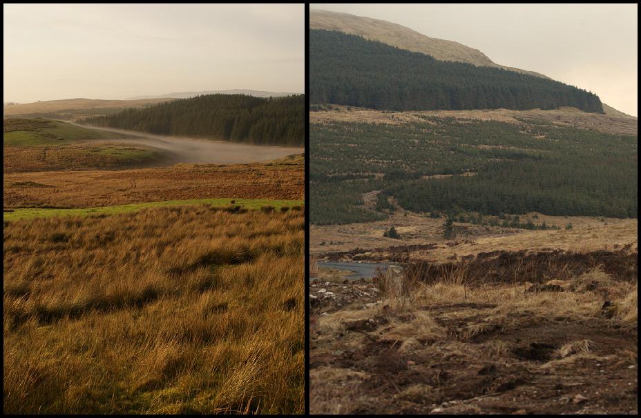 Even a cursory comparison between black grouse habitat on the Chayne and that found in the Galloway Forest Park shows what a mountain I have to climb. I have put two photographs together to compare the vegetation and found it to be a depressing experience. Both photographs show lek sites, but the one on the Chayne only has a single active male while the one at the Galloway Forest Park can have up to twenty. Heather and a variety of trees at different ages can be seen across the whole hillside in the Forest Park, providing an enormous quantity of “marginal” vegetation and shelter for birds. By comparison, the Chayne is simply open rushes and grass, bounded by a wall of mature forestry. There isn’t a stick of heather to be seen.