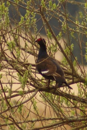 From what I can gather, my blackcock has switched his lekking ground away from where I first saw him last week in the lambing field to the shepherd’s garden, and he contents himself with displaying up and down her fence and over her lawn every morning at dawn. Last time I went up to visit, he glided down over the road from the hill above me and landed beneath a willow tree. He flew like a fantastic streak of blue and red and the image is now imprinted in my mind. After a moment to rearrange himself, he popped up into the willow and started eating buds like some sort of extraordinary hen. I watched him for half an hour until he suddenly got bored and dropped down into a wet patch above the house’s septic tank.