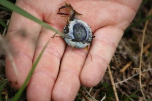 As I prodded into the bank around me, I noticed a small scrape between a mesh of dead bracken strands. Something gelatinous and wet lay in its centre. Close examination showed the damp scrap to be the lamb’s eye, plucked and buried by a crow. I had no idea that crows stashed excess food in secret locations, but I suppose it makes perfect sense. Confronted with the dead body of a lamb over twice your size, it is only reasonable to quickly dismantle the corpse, conceal as much as possible and only then fill your crop.