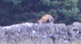High up on the hill above us, a pale shape materialised along the topstones of the neighbour’s drystone dyke. It sat for a second before ducking down into the trees, but it was long enough for a photograph. Only once we had got the camera home were we able to zoom in to the blurry picture and identify it as one of this year’s fox cubs. There is clearly much more work to be done.