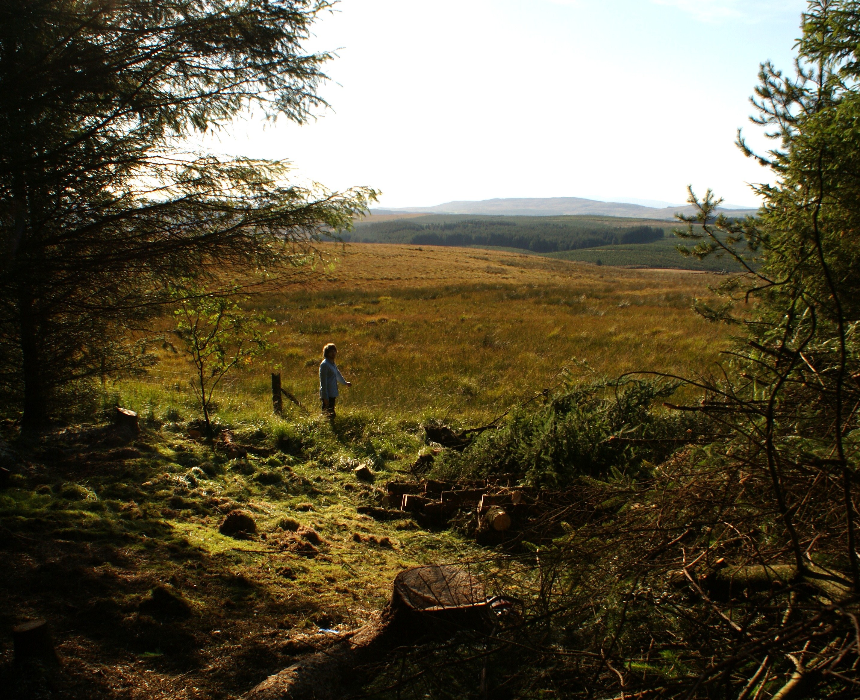 The great incentive to push on was the fact that each tree we cut down revealed a little more of the stunning view to the west: to the Rhinns of Kells, Cairnsmore of Carsphairn and the Garryhorn. Each branch opened up another sweeping vista of chocolate brown hillsides and shattered peat haggs. The sun in ragged windows raced over the distant ground, and it was hard not to stop every five minutes to take it all in.