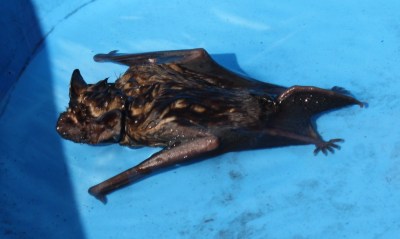 It was a grim morning, but by the time I had got up and done the worst of today’s work, it was looking a little brighter. I went out to see the ferrets and issued them with a whole pork kidney to nibble away at their leisure, then turned round to the massive blue paddling pool which I sometimes use to throw a shadow on the ferret cage when it’s very hot. It was almost an inch full of water, and in the far corner, a large dead maple leaf caught my eye. With some horror, I noticed that it was moving. As I stepped closer, I saw that it was not a leaf at all, but that it was actually a large bat wriggling around in the water.