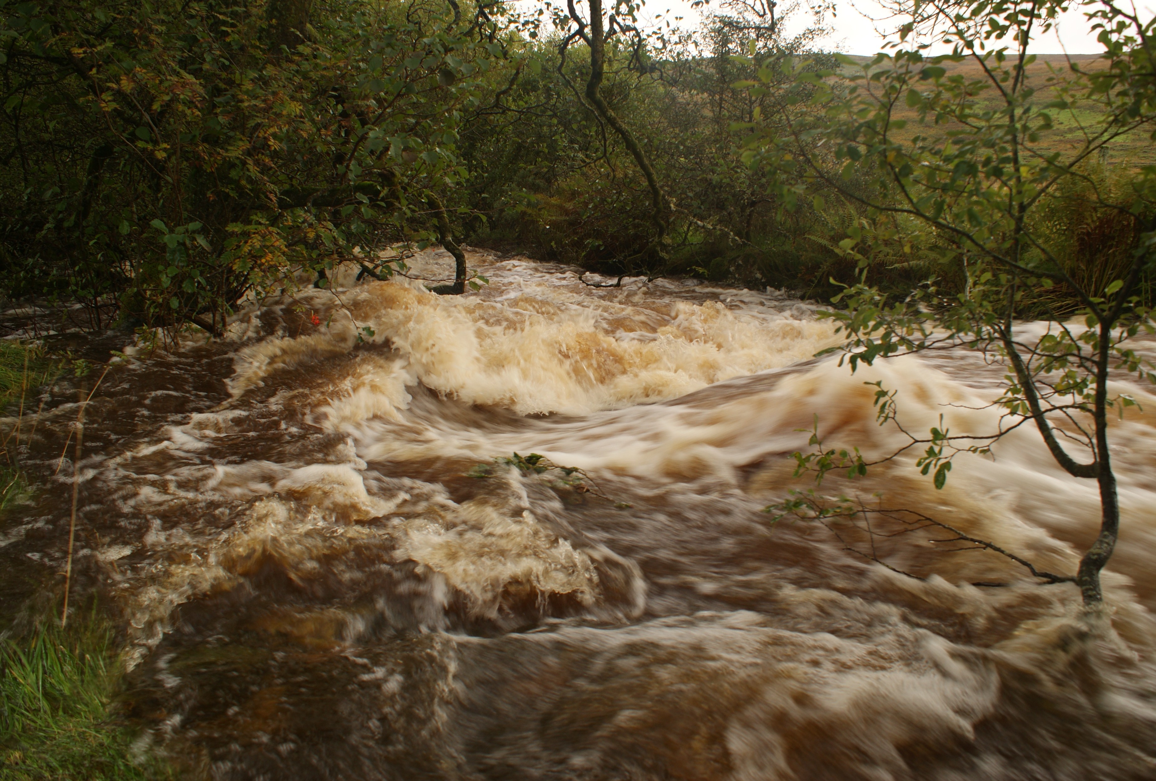 Wild amber torrents of frothing water came tumbling off the hill like living animals. Soft, comfortable areas where the bog myrtle grows entertain a mild and passive trickle of limpid water during the summer, and it is sometimes easy to forget that the low lying areas are any wetter than anywhere else. Today we had a reminder. Great slate passages raced through the bogs, while the hills all around were split apart by snowy white bolts of water.