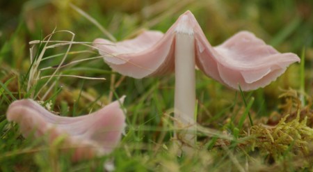 Walking up through the pasture, I took a detour to see if rabbits were still using a big warren below the old barn. Now that the ferrets have shown their mettle, I’m always on the lookout for ferreting opportunities. Sadly, those holes were choked with moss and thistles, but a small pink blob nearby caught my attention. It was a fungus of some description, and while one was open and slightly broken, another one was still closed and was being rapidly consumed by a vile black slug. I took a photograph and posted it on iSpot.com, where I was quickly informed that it was a pink meadowcap, commonly known as “the ballerina”.