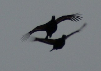 The sky sang with wingbeats as I crouched down and snapped photographs madly. In less than five seconds, they were gone. Small flashes of black and white twinkled on the opposite side of the valley as they settled again, and I was left with a strong mental image of powerful birds pumping their wings in the damp gloom. Looking at my photographs when I got back, I saw that their wattles were all down as they flew, meaning that they had probably stopped lekking when they were disturbed. Autumn lekking displays don’t last as long as leks in the spring, so it could be that when I saw them, at about nine o’clock, they had already packed it in for the day.