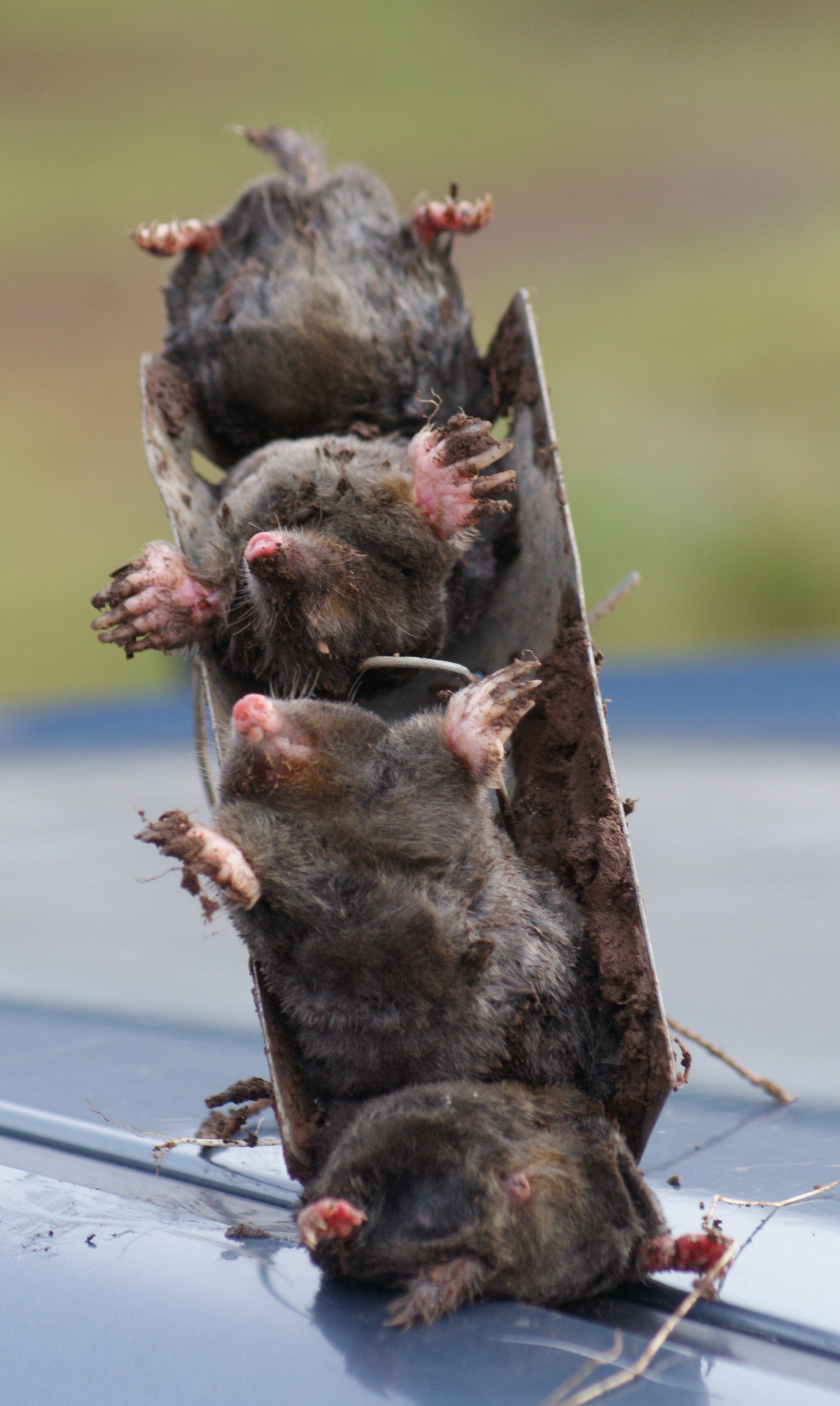 Moles have a variety of different tunnels which they check according to where the worms are operating. Worm movements are dictated by barometric pressure, so moles will often hunt in some areas of their tunnel networks during mild weather and others during hard weather. I learned early on that not catching a mole in a trap within 48 hours does not mean that failure is guaranteed. It is often a good idea to trap when a change in the weather is coming, so that if you don’t catch to start with, you might after the pressure has altered.