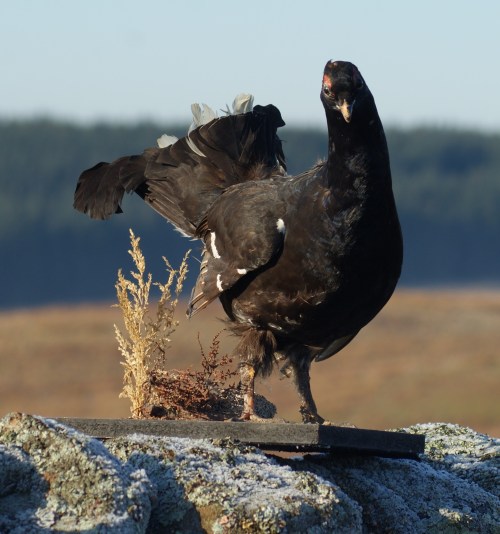 When pheasants pass nearby, he becomes more proactive and begins to behave more like a blackcock in the presence of others. Yaffling and striding around with great pomp and circumstance, he locks horns with pheasants without a backward glance. However, unless there is a direct reason for him to scream and attack, he is relatively placid and carries out his lekking display with a degree of satisfied patience.