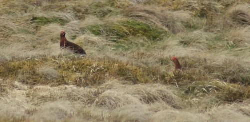 The red grouse territories on the Chayne are necessarily massive. The heather quality is so poor that pairs of birds need a great deal of space to rear their broods, and while this is in the process of changing, it limits my ability to learn about the birds. Driving south of Edinburgh this morning, I had a rare opportunity to watch red grouse settle a territorial dispute just a few feet from the car, and although I nearly caused a major car accident by slamming my brakes on suddenly to take photographs, I was well satisfied by the event.