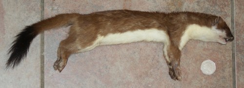 As the timber roof came off the trap, I looked down on a seriously impressive male stoat. Having got used to dealing with weasels over the past few weeks, a stoat was always going to look big by comparison, but this brute was a real monster. After taking him out of the trap and resetting it, I took him home and compared him to the ermine which is still sitting in my freezer. He was four inches longer, measuring a fraction less than nineteen inches from nose to tail. On the scales, he weighed in at just under a pound, making him not only the largest stoat I have caught so far, but also the largest that I can find any record of in reference books. Although he was in his summer coat, he still had several longer white hairs along his sides and flanks which suggest that he was white just a few weeks ago.