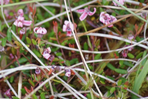 After months of tramping daily across a barren moorscape, the undergrowth has recently come to life on the hill. After the cotton grass began to subside last week, other flowers have emerged to lurk amongst the downy wreckage of fluff. The most noticeable has been wild cranberry, which grows in two or three quite large patches on the moor, and which is recognised by a fantastic collection of tiny pink flowers.