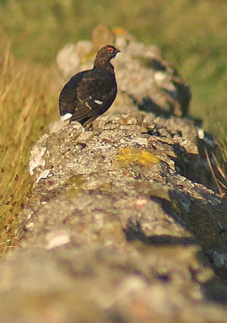 I’m not the world’s greatest dyker, but with a lovely sunset and a female hen harrier working through the rushes below me, there were plenty of worse ways to spend the evening. After an hour, I looked up to see that my favourite blackcock had landed just fifty yards away and was eyeing my progress with a critical eye. He didn’t exactly say “oo, I wouldn’t have put that stone there”, but his expression clearly revealed the fact that he was not impressed with my handywork. I returned the compliment by noting his shabby appearance and lack of tail.