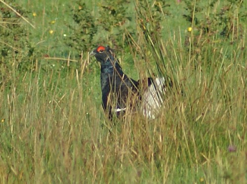 Yesterday morning, I was thrilled to hear the distinctive bubbling note on the clear hillside above the gate burn, and I spotted the culprit standing stock still in the centre of a small clearing between the rushes. Unlike his displays in April, he was not using the classic “three part coo” which rise in pitch one after the other before returning to a lower gear again, and the bubbling was a scruffier and less well organised version of the real song. His wattles weren’t fully inflated, but he did try a couple of little flutter jumps before packing up his tail and feeding for a few moments before starting again.