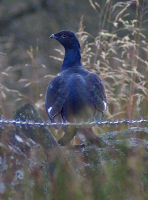 Blackcock are contrary birds. Setting a trap for a stoat this morning, I was treated to a display of overbearing insolence by a lekking blackcock that was so outrageous that I laughed aloud. He stamped around within thirty yards of me, glaring and sneezing as if he was challenging me to mortal combat. Finding the same bird this evening when I returned to the farm to mend a dyke, I had a fleeting opportunity to photograph a cowering snake necked fool with no wattles and all the courage of a day old mouse. How is it possible for one bird to switch from swollen necked superhero to sneaky shirker within a single day?