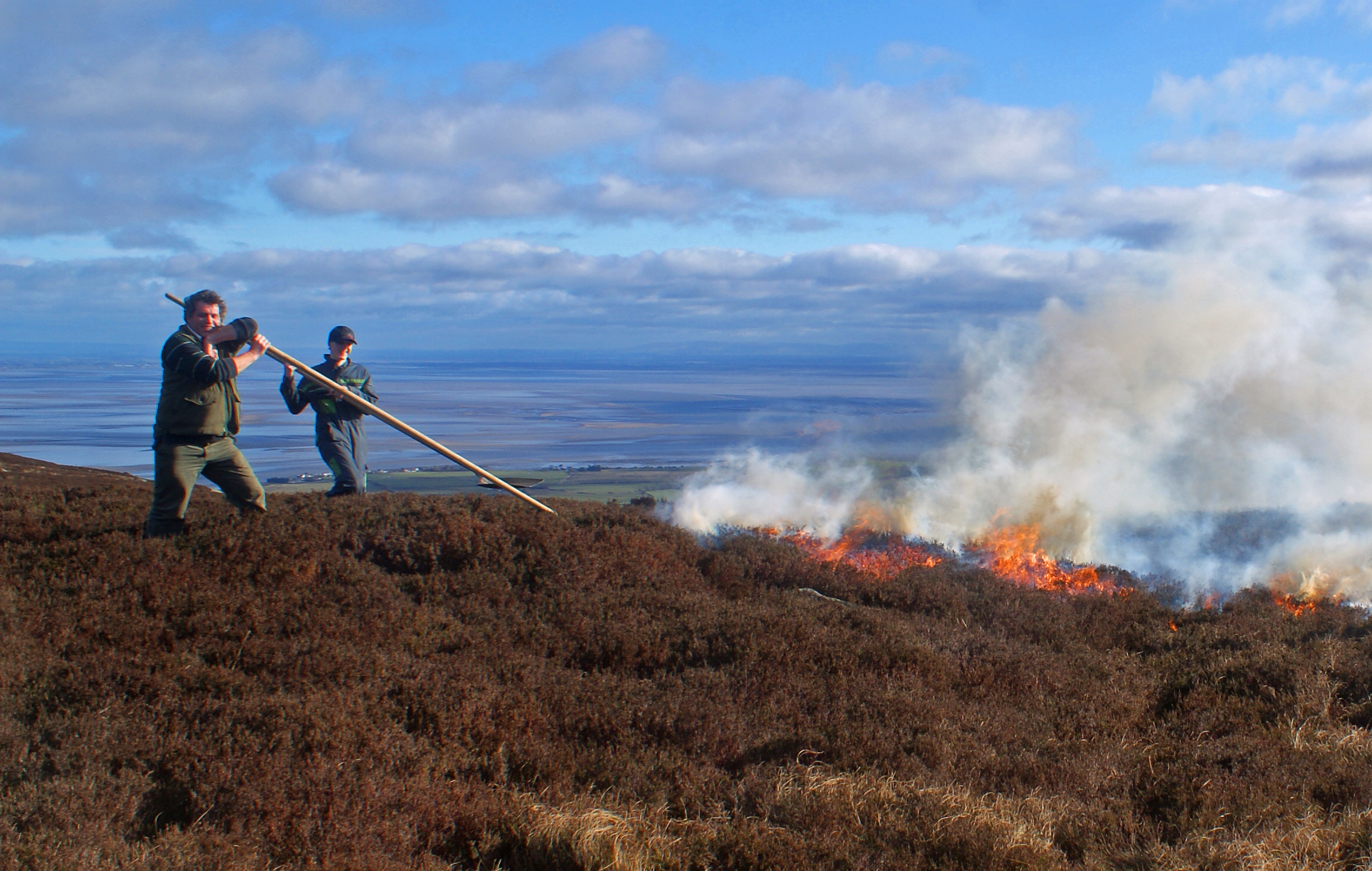 It was a bright, breezy morning on the Solway as we headed up the steep slopes where heather lies in abundance and red grouse lurk in the thick swathes. The hill hasn’t been burnt for more than a decade, and the chief obstacle facing the local grouse is the great quantity and poor quality of the undergrowth. It’s hard to imagine how the birds can even land in heather that is higher than your knee, and most of the droppings we found were lying either on protruding rocks and boulders or concentrated in small patches of grass. Any burning was sure to make a big difference to the habitat on offer, and within a couple of hours we had made some changes.