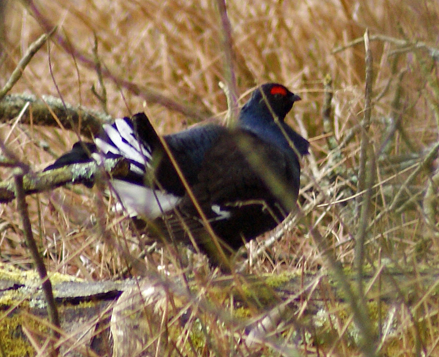 My favourite blackcock has been behaving very strangely recently. Looking back at last year’s blog entries from February, I see that by the beginning of March, he was getting on for full lek. This year, he is being incredibly bashful and is only lekking under thick cover. The only time I’ve found him out in the open was when the clouds were down and the visibility was less than thirty yards. I also hear that he is lekking after dark, between ten and eleven o’clock at night. I need to get up there this evening to hear it for myself, but it seems like something very strange has been going on. Perhaps he has been spooked by something and has the sense to withhold his full lekking display.