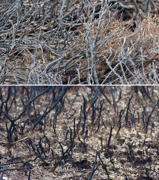 The best sort of burn is midway between the two extremes – a fire which burns down the heather stalks so that they are little more than short black stumps and which also burns away all the litter left by dead plants from previous years. This not only means that grouse and moorland birds are left with a clear open patch to roost on, but it also ensures that heather regeneration takes place from stalks as well as new plants which grow up from the soil. This sort of neat burn happened on the first day we burnt down on the Solway (pictured above, bottom).