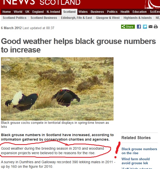 Good to see that the Forestry Commission and others are keen to trumpet the recent increase in black grouse numbers, which, as well as the small matter of mild weather conditions, was apparently brought about by woodland expansion projects… (?)