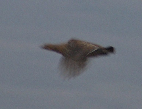 My larsen trapping regime has forced me to visit areas of the farm which are normally too inaccessible for me to go to on a regular basis, and I’ve learnt some interesting new things over the past month. I was forced to watch a fox charge away through the rushes yesterday evening when, for the first time in a while, I didn’t have my rifle with me (that won’t happen again), and this evening I flushed a greyhen on my way out to empty a cage trap. I managed to take a very bad photograph at quite long range in terrible weather conditions which proves what I saw, but I’m now worried about its significance.