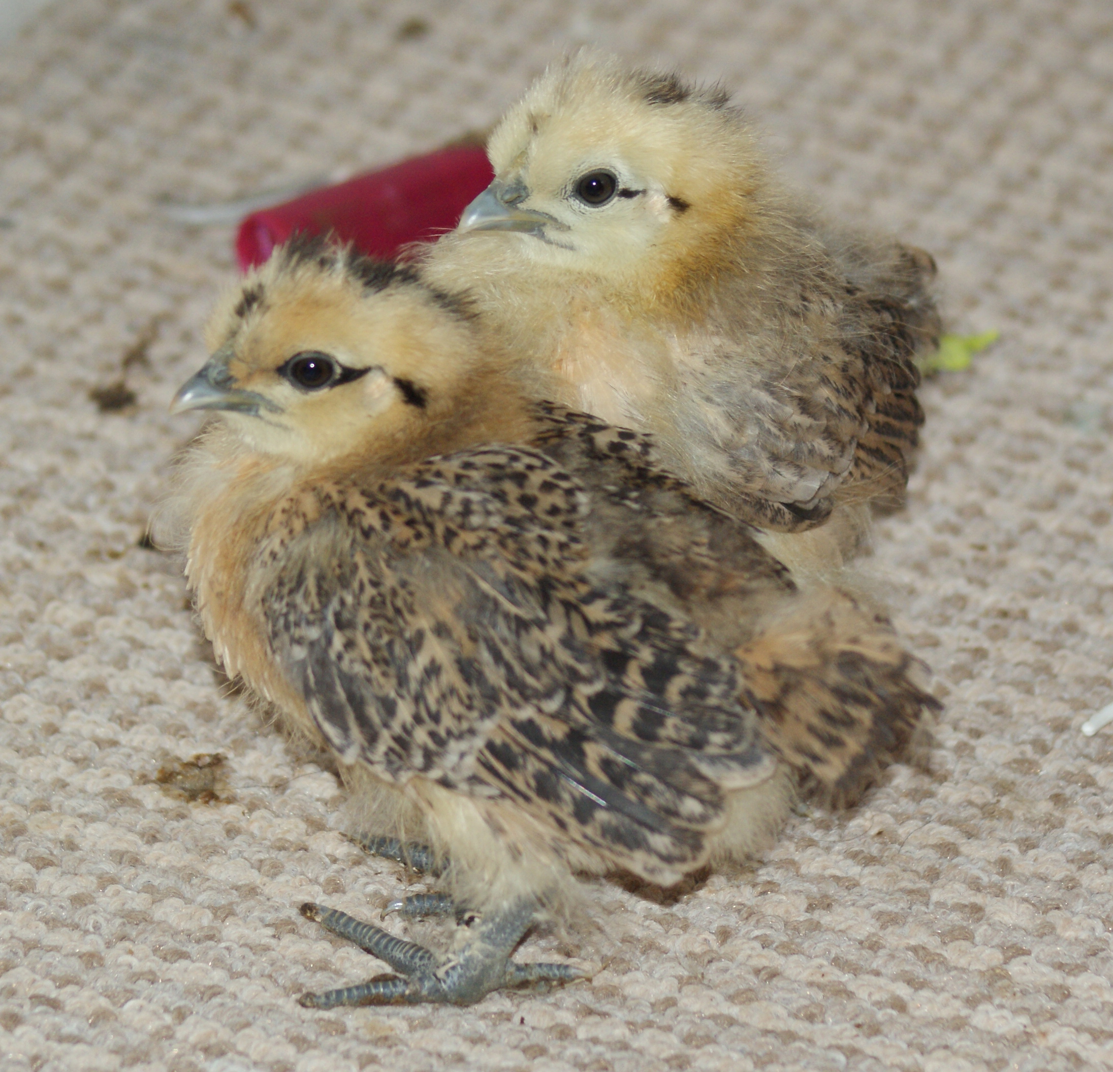 At almost three weeks old, it’s still impossible for me to tell what sex my two silkie x light sussex bantams are. I’ve followed all the usual criteria for sexing them, and the best I can deduce is that they are one of each sex, although which is which will be the next question. Now that they’ve got their wing feathers, they are quite pretty little beasts, and I hope that they will come in handy next year, sitting on eggs and bringing off pheasants and partridges for next season.