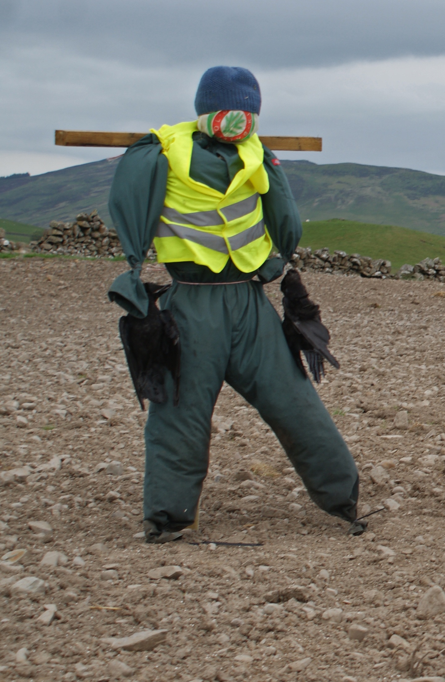 My response has taken two prongs. On one hand, I am trapping rooks as fast as I can with three larsen traps and a larsen’s mate next to a feed hopper on the hill above the game cover, and on the other, I have enlisted the help of a scarecrow. “Mr. Lightbody” the scarecrow is nattily enrobed in my old boilersuit and has a linen bag full of hay for a head. He’s not your whimsically pastoral scarecrow of “yellow brick road” fame, but more of a hard talking weapon-head with an appetite for disruption. If I were a crow, I’d leave the game cover well alone, but sadly, as is the way of all scarecrows, his novelty will soon wear off. I expect that the rooks will soon get used to him and then ignore him altogether, but he may just buy me a few hours of peace and quiet during which time the seedlings can get a foot in the door.