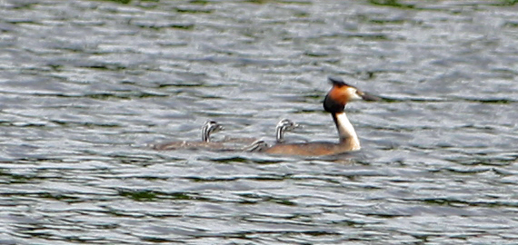 Down on the loch itself, it was great to see that the great crested grebes have also had a trio of chicks, beautifully marked in vertical black and white pinstripe. These little birds are almost impossible to see against the rippling water, and they can already dive down after their parents. Most of the time, however, they seem to prefer squabbling over who gets to sit at pole position on the adult’s back.