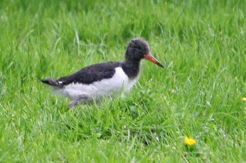 June is a great month for spotting young birds, and living where I do now, I’ve had some great chances to see chicks of all different species. The most conspicuous have been a pair of seapies (oystercatchers) who seem to have managed to bring off three chicks in the hayfield between the house and the loch. I can hear them chipping away all day and night, and they attack anything even remotely resembling a predator with gusto. I watched them chasing a pair of red kites yesterday, and they kicked hell’s bells out of a buzzard who happened to be passing at the wrong moment. The chicks vanish into the grass at the slightest sign of danger, leaving the parents to “scramble” and intercept whatever it is that has caught their attention.