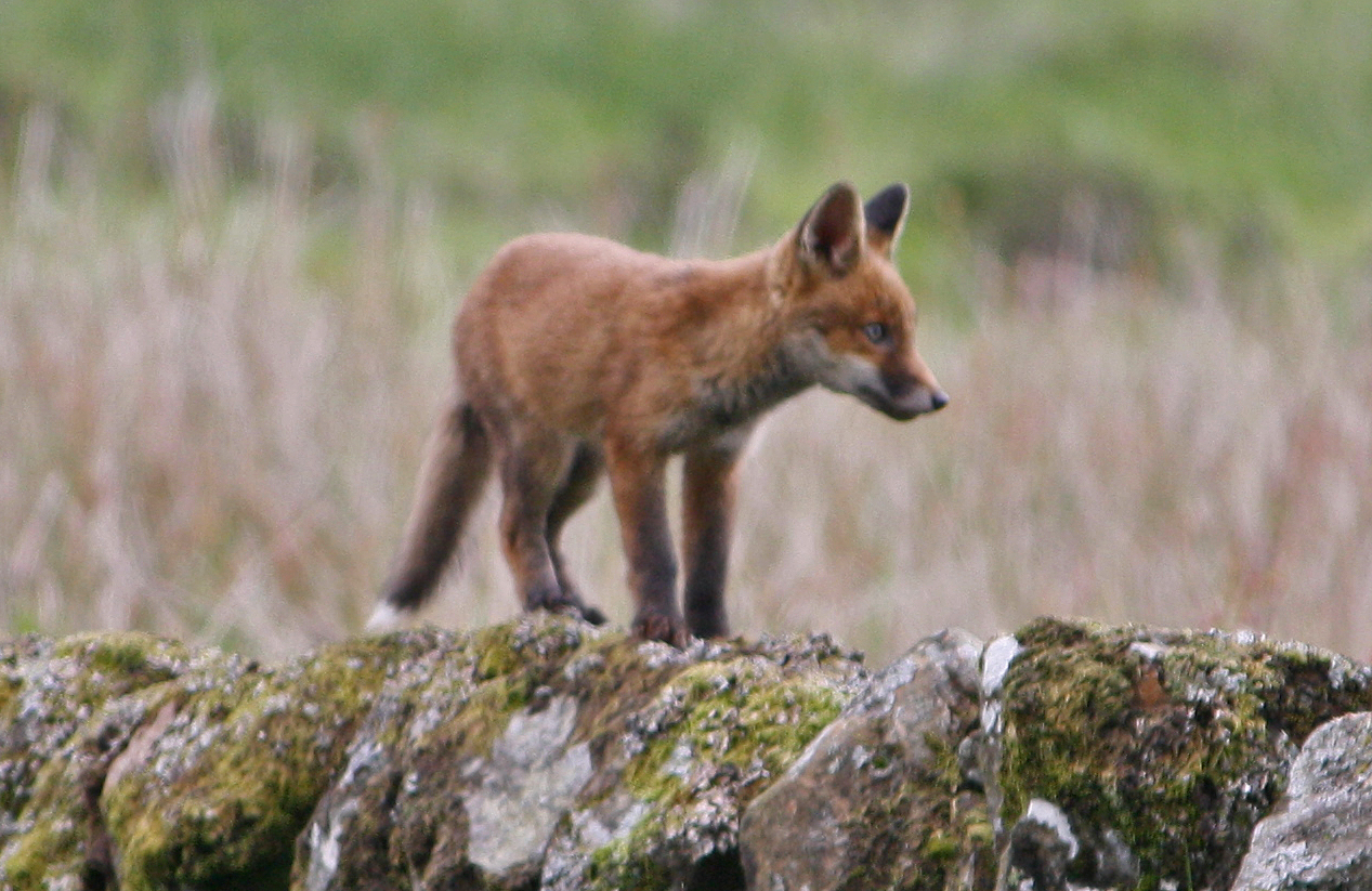 After four consecutive days of rain, it was nice to get the chance to head up around the hill for a leisurely walk this afternoon. There was nothing in my traps, and as I came off the inbye fields and stepped into the car, something caught my eye on the road by the shepherd’s cottage. My first reaction was that there was a ginger cat walking up and down the verge, but as soon as I had had a good look, it was clear that it was something altogether more sinister. A fox cub hopped up onto the dyke and looked away, and I ground my teeth with fury to find that all I had was a camera. I took this photo (above) before it dropped down onto the other side of the dyke and vanished into the long grass.