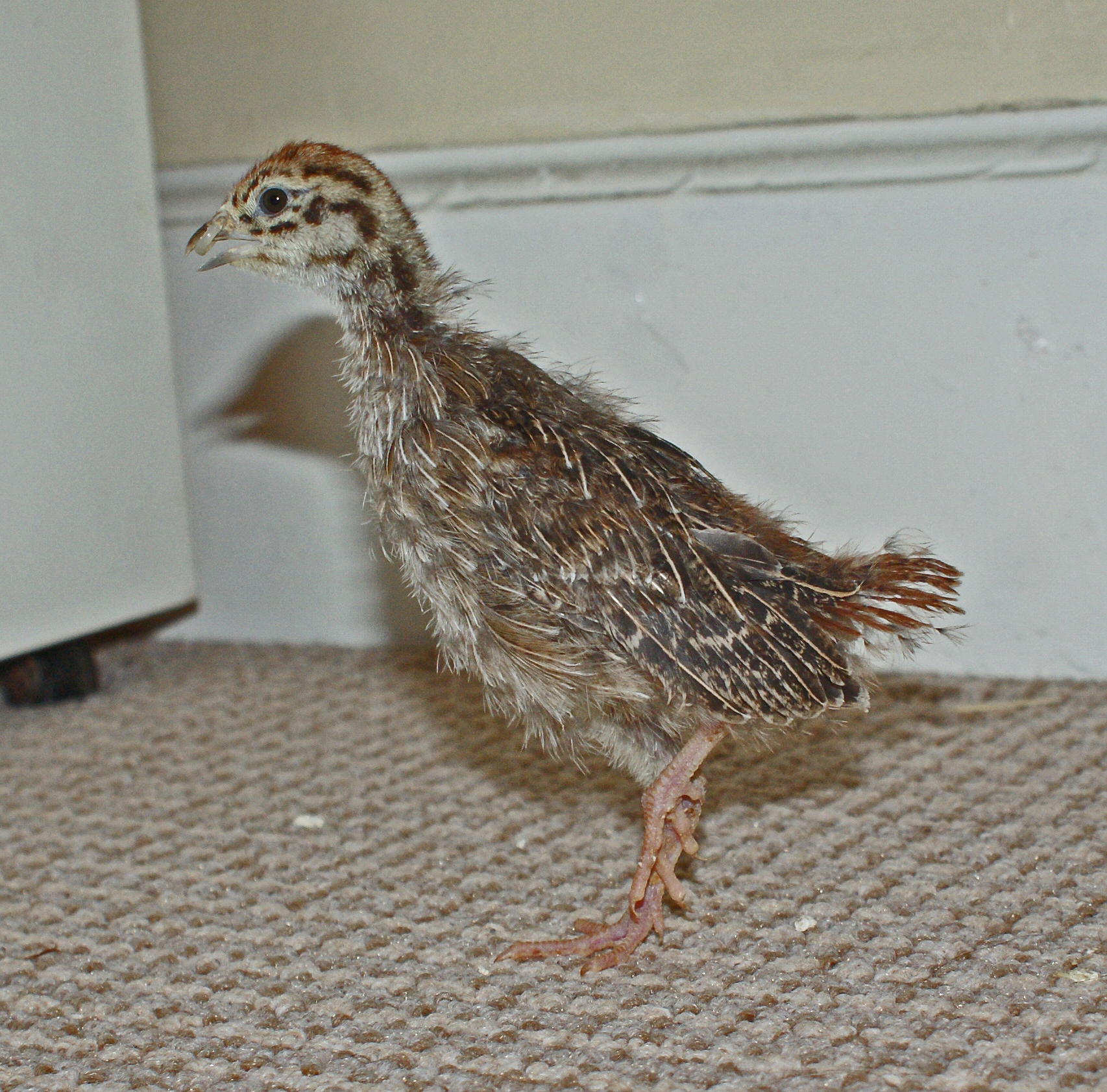Continuing with the series of partridge pictures, here’s a photo I just took of the single grey partridge at almost precisely four weeks old. He’s come on in leaps and bounds, but I’m very conscious of the fact that he’s been on poultry feed, which doesn’t have nearly a high enough protein content for him. In the wild, grey partridge chicks can flutter for short distances by the time they’re four weeks old, whereas this guy is hardly able to get his arse off the ground.