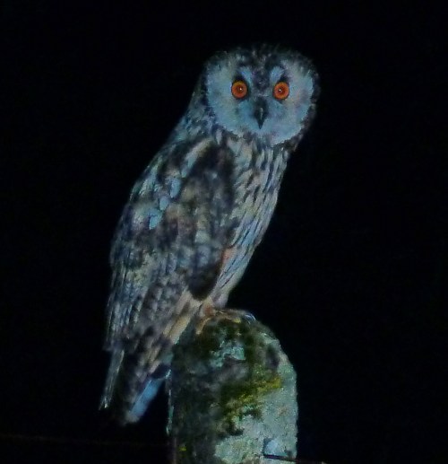It’s ten miles into Dumfries, and there’s always something to see when you drive the distance late at night. I routinely see barn owls and tawny owls, but I was proud to be able to identify a long eared owl on a fencepost as I drove past at twenty five miles an hour, and prouder still that I came away with a picture of it. I think long eared owls are great, and this is only the second one I have ever seen. Their eyes are the giveaway, and there is something sinister about the peculiar orange glow they have, even in dull weather or partial darkness.