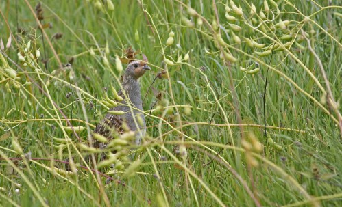 The partridges are doing extremely well in their game cover, and I’ve now trickled half of them out into the field of bolted radishes and turnips. They are extremely loyal to their pen, and can be found within a few feet of where I let them out every day. I spent an hour this afternoon watching them in the crop, and they are certainly foraging and feeding as much on the plants as they are on the grower’s pellets which are always on offer in a floorstanding feeder nearby.