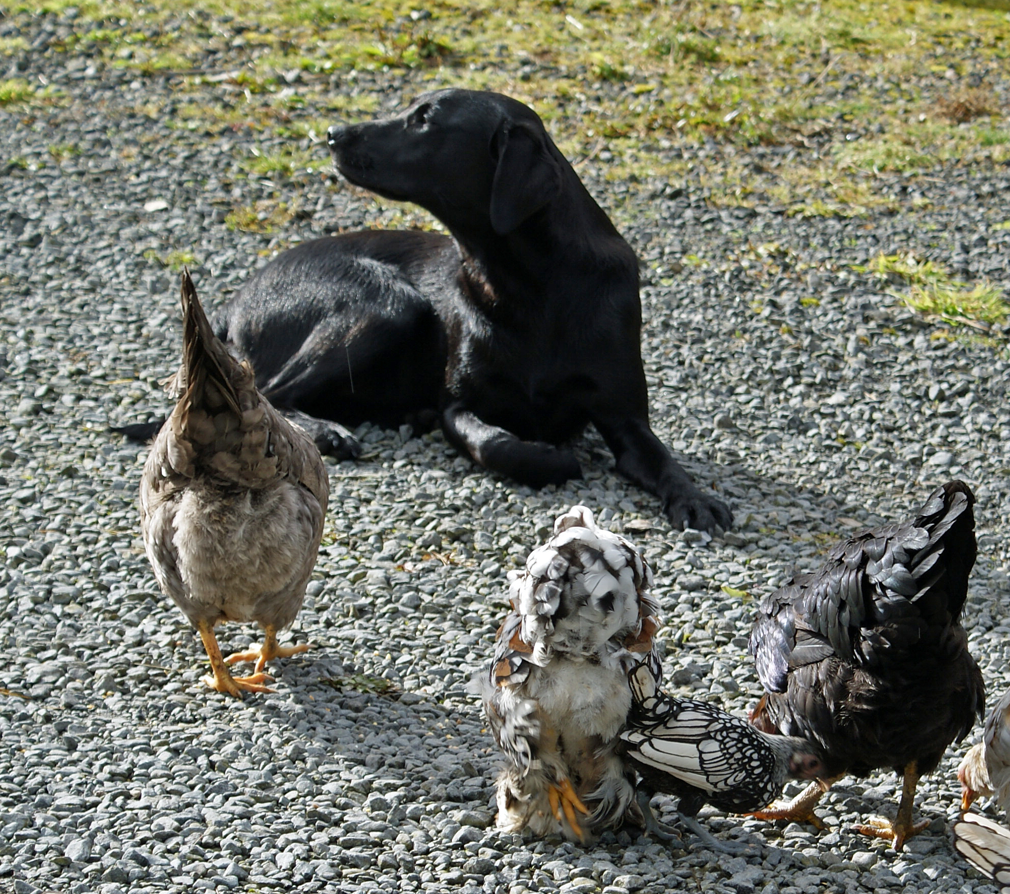 Being a labrador, she eats anything, and her demand for food means that she is even fond of grower’s pellets. Now and again, I catch her eating growers and watch as the hens work their way closer and closer towards her. Inevitably, they push her away and she runs happily over to me as if she was full anyway and didn’t want any more. What a wimp.