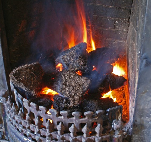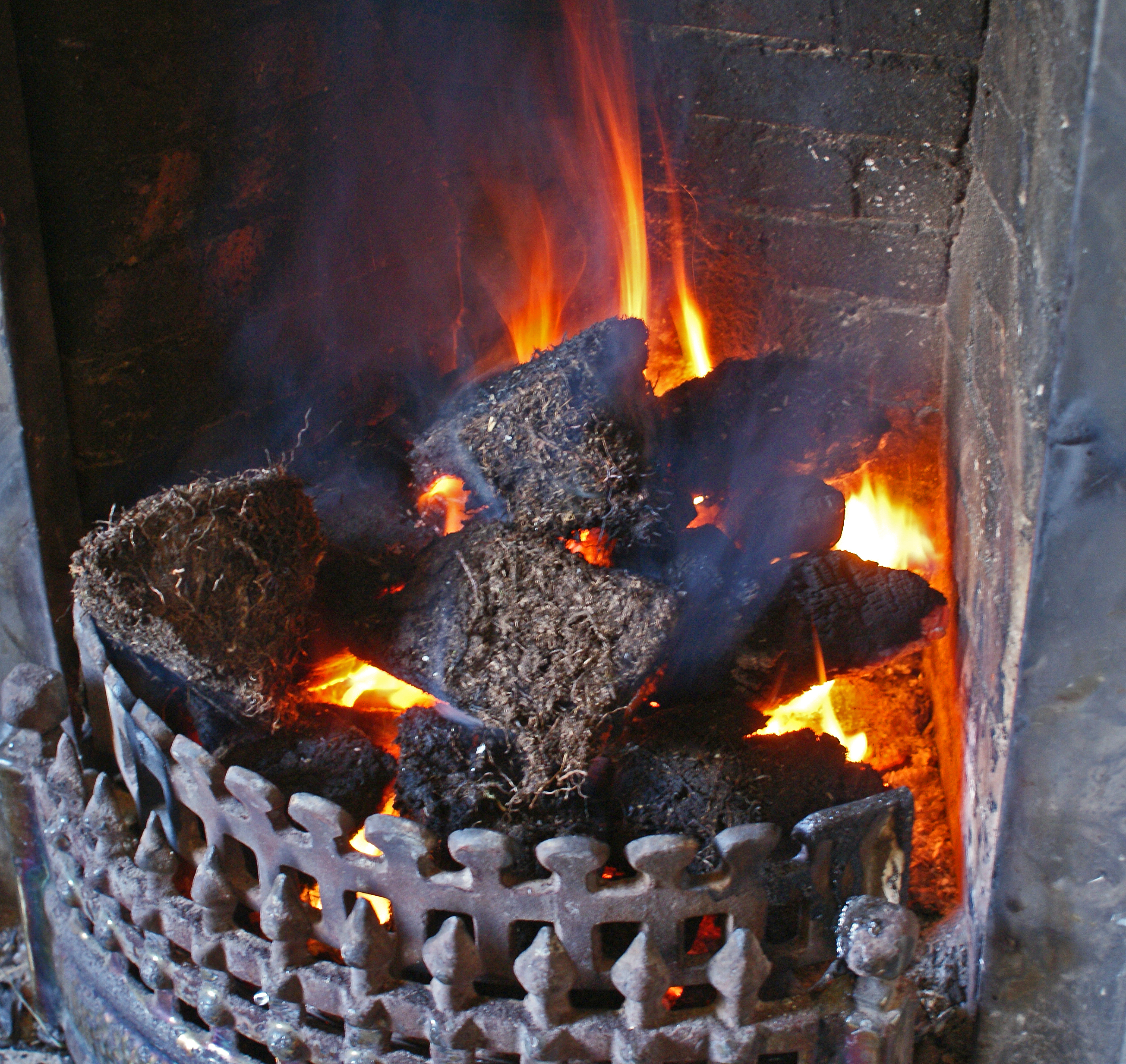 Due to the fact that it’s a schizophrenic day for weather in Galloway, swinging between mild sunshine and miserable hail, the first thing I did this morning was light the fire so that there would be some heat in my office. As an experiment, I burnt some of the peat which has now been drying for more than six weeks, and found the results very much to my liking. It’s still a little damp, but once the peat starts burning, it kicks out some serious heat, not to mention the musty perfume of the smoke.