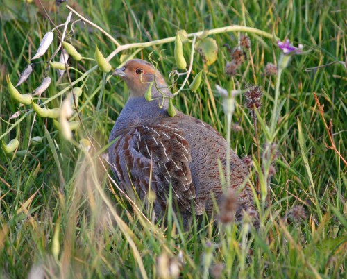 Just a brief update on the grey partridges which have now been up on the hill for two months. Although it’s risking every cynical twist of fate to say it aloud, I haven’t lost a single one since I got them in July, and they are pretty well settled in the game cover. Since I put out a small handful of cock birds towards the end of the week last week, they have been much less loyal to the immediate vicinity of their pen, and I wonder if one of those cocks had been responsible for keeping them so determinedly rooted to the same few square feet. They now range throughout the game cover and into the adjoining field, which is mainly rushes and clover, and they make short flights back and forth to their feed hoppers as the day goes by.