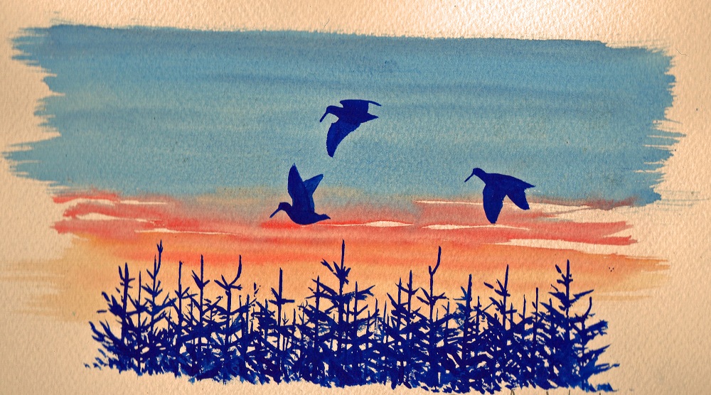 I put up more than a dozen woodcock on the walk back to the car, and wondered whether they have all arrived in past twenty four hours, or whether they were here all along and I was looking in the wrong place. As soon as I got back, the only thing in my head was a crystal clear mental image of the three birds I’d seen flying together, and I’ve spent the past hour painting this picture (above) into my gamebook. Yes, I suppose that since I didn’t hit anything it doesn’t really deserve a mention in the game book, but I have a feeling that those three shapes in the wind will stay in my head far longer than any number of pheasants.