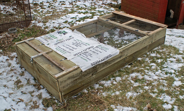 The partridges seem very settled in it already, and I like the way the design allows for them to creep quietly away when you approach. Although I didn’t think they’d like the dark box at one end, they seem to enjoy lingering around in there, and I suppose it gives them a feeling of privacy and security. I could do with a few more of these pens, but given the cost of wood and the time it took me to make, the other pairs will have to make do with their perfectly adequate but slightly less glamorous quarters.