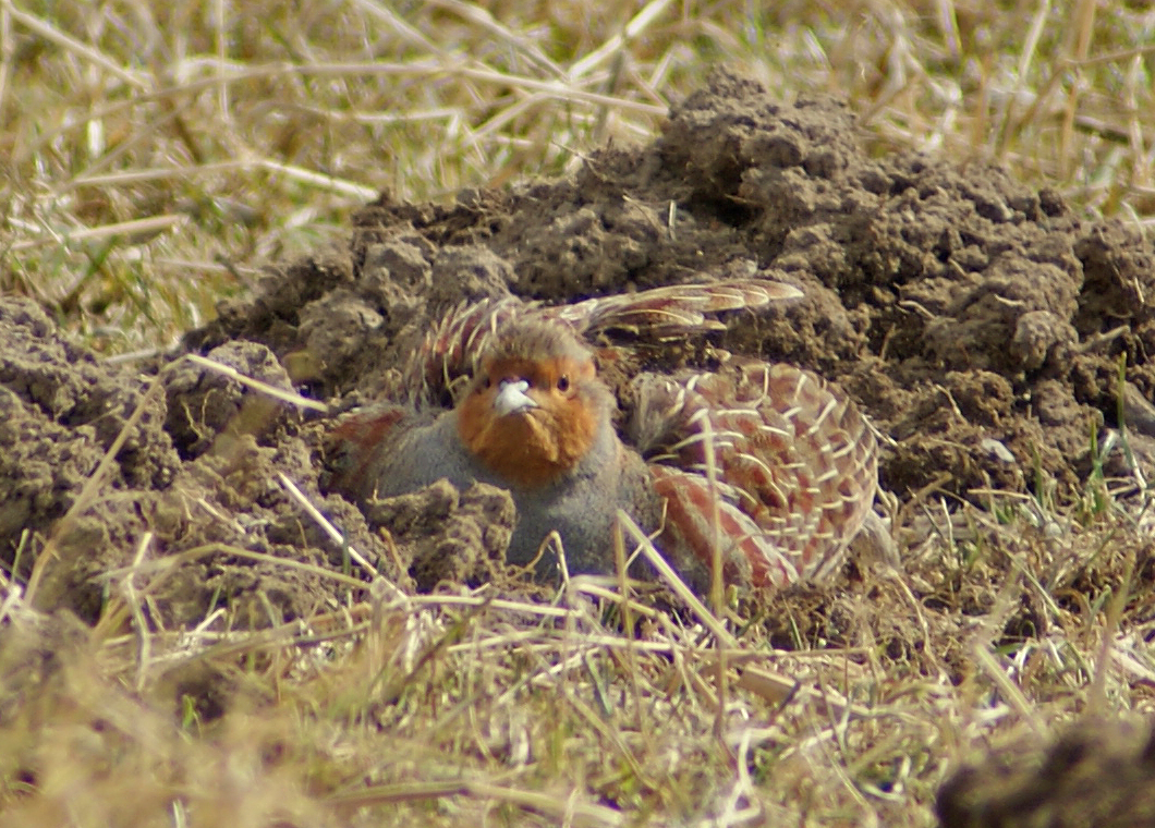 I was very pleased to see that my first pair of released grey partridges are still hanging around the remains of the game cover. I was worried about them after five and six foot high snow drifts buried their feed hopper, but was planting blackthorn trees in the new hedge this morning and heard a very familiar little chuckle coming from the open field behind me. I had to look for some time before I saw the two little shapes dustbathing on a pile of molehills fifty yards away. Their camouflage really is quite impressive, and by the time that I had run back to the car for the camera, I then had to look hard to find them again.