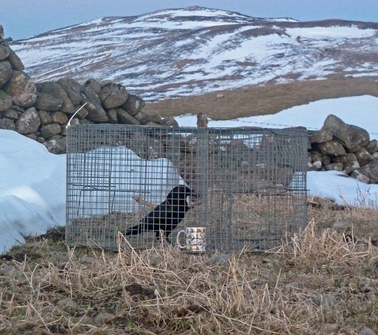 Given that we are about a month behind schedule for the breeding birds, it seems unlikely that there is much to be gained from running larsens for a few more weeks. However, there has been a pair of corbie crows coming in to one of my last feed hoppers, along with a range of rooks, pigeons and jackdaws, so it seemed worthwhile testing the water with a trap this evening. It could well be that the crows aren’t feeling territorial enough to bother with it yet, but it will do no harm. I set up the trap and then pushed on with planting the new hedge as the sun set this evening, lighting up the streaks of snow which line the dyke-backs further down the glen. On second thoughts, perhaps it’s worth catching the rooks and jackdaws first, since they’re always so easy to gather up. Then I can concentrate on the corbies when they are vulnerable enough to be caught – although in normal years I would be well into trapping of all kinds by now.