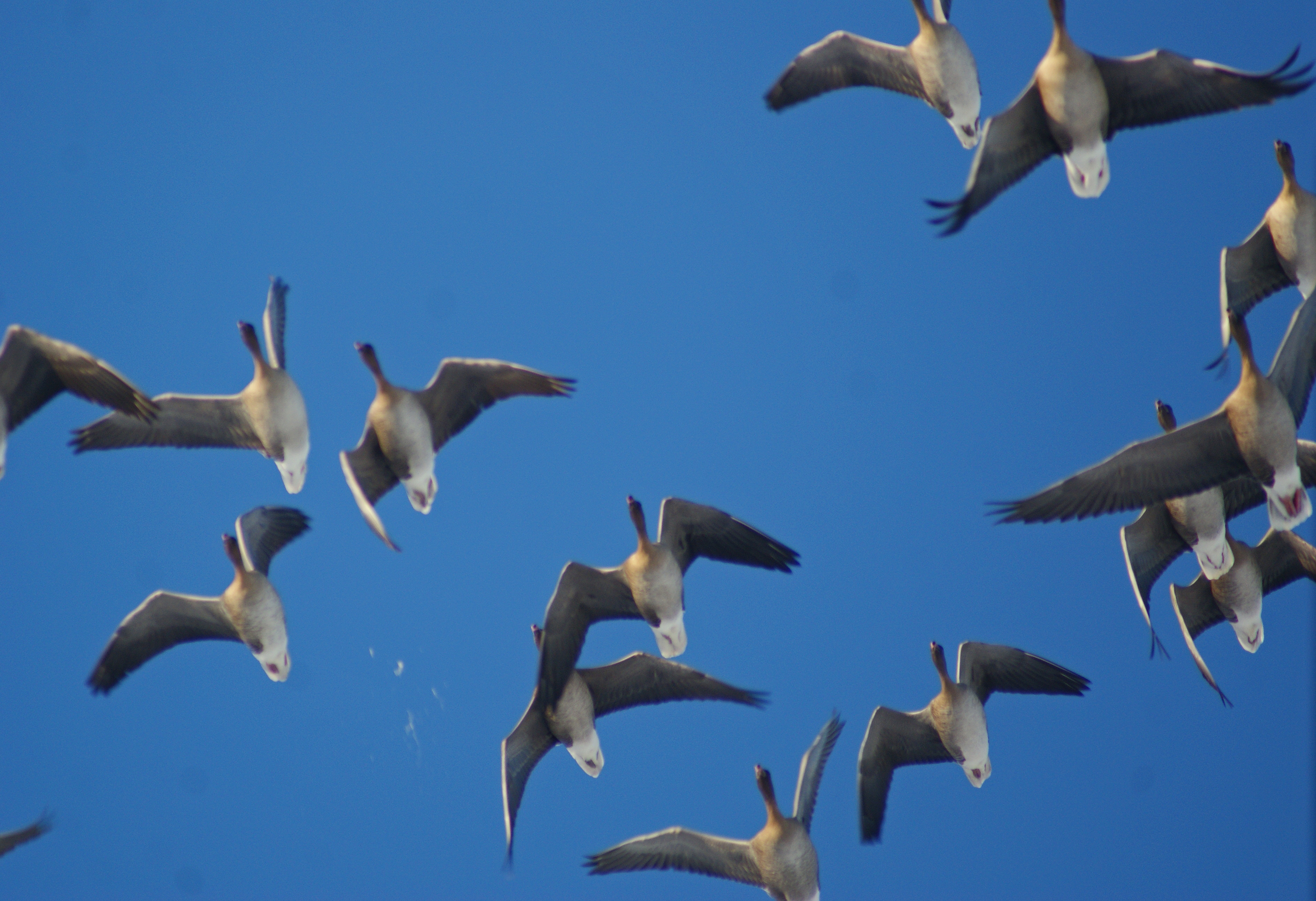 As it happened, a slight breeze allowed the geese to gain some good height by the time they passed overhead, and the thrilling lines of belling birds passed out of range overhead. I had my gun down by my side anyway, standing with my mouth hanging open as the whistling stacks of muscle and song came working by. The great joy of geese is their unassailable timelessness; the very sound of a pink-foot is the distilled essence of some deep, primal element, and when it is massed into a choir of endless scale, it comes within a whisker of bringing a tear to the eye. We stood and watched them pass overhead for five minutes: lines and Vs and ticks; groups of a hundred alternating with tangles of ten and thirty in a continuous, unbroken swathe, the end of which was still rooted on the soggy mud half a mile away. I could feel my heart pounding in my chest and roaring in my ears, feeding on the swelling joy that this sky-filling ensemble seemed to stir above the flat and infinite horizon.
