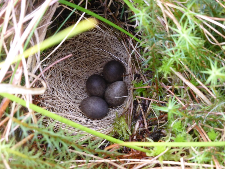 This afternoon might possibly have led to one of the most exciting discoveries I have ever made on the Chayne. Walking back from checking my larsen traps on the back hill this afternoon, I put up a pipit from her nest almost at my feet. By standing back and craning my neck, I could see into the nest and found that there were four dark brown eggs inside. The closer I looked, the more I started to see that one of the eggs was much paler and slightly larger than the other three. I may be getting way ahead of myself here, but compared to all the other identical pipit eggs I have seen in the past week, this is a weird one.