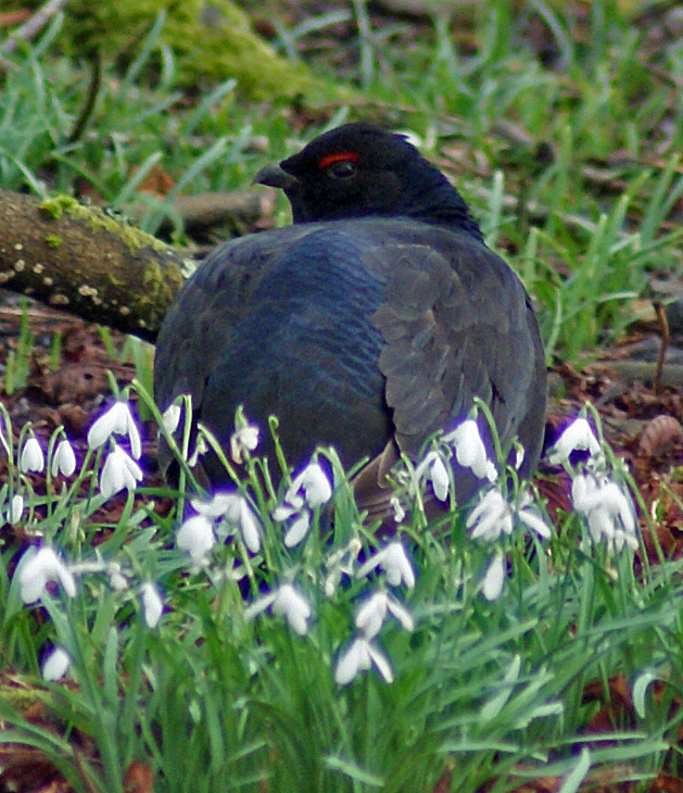 I enjoyed a grand reunion with an old friend on Saturday afternoon. Spying for a fox on the high ground (on which more to come), my eye was caught by a black shape against a drift of snow. Assuming it was a raven, I scanned the binoculars along the crest of the hill and only returned to the apparition five minutes later, by which time it had become much more conspicuous. I found myself staring at the same blackcock I followed all spring, standing proudly up on a tump of moss seven hundred yards away. Although I have seen glimpses and signs of birds all winter, this was the first time I had seen this individual since November, and I was encouraged by the momentary suggestion that he was not alone. I could have spent all afternoon watching the bird(s) browsing through the frozen grass, but a fox materialised three hundred yards away to the imagined overtures of Prokofiev’s Peter and the Wolf.