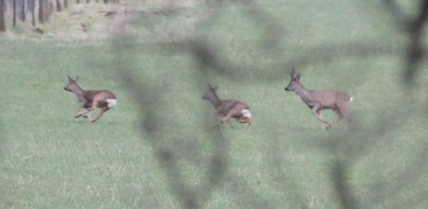 By sheer chance, I happened to stumble across an extraordinary drama while heading up the hill on Friday. Movement caught my eye through the trees as I drove up the road, and I pulled over onto the verge to watch a group of roe deer running wildly across an open field. Wondering what had disturbed them, I scanned the binoculars up and down for a few seconds before realising that they were chasing themselves. A buck (incidentally the same fellow pictured at the bottom of In Velvet (part 2)) was chasing a doe and her single doe follower up and down the field.