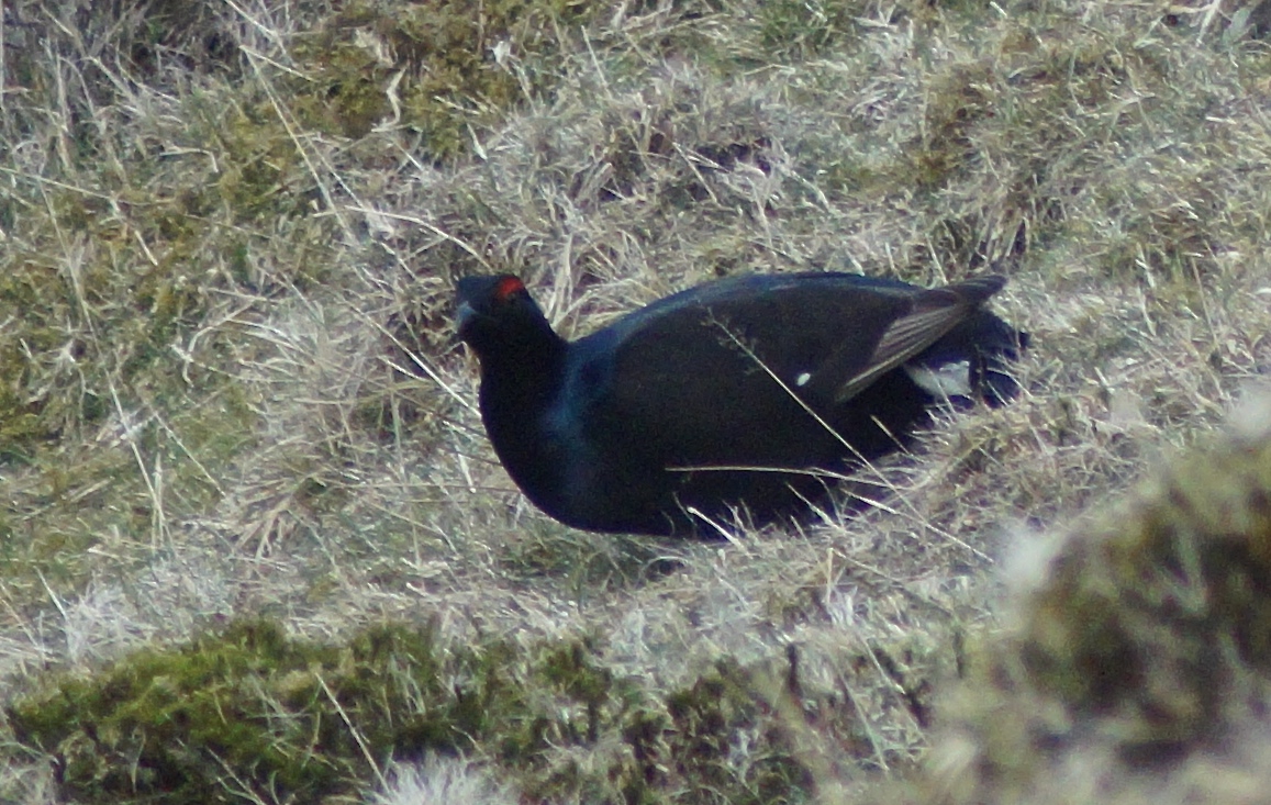 After another excellent day volunteering with the Galloway Fisheries Trust to clear sitka spruce scrub from the banks of the Little Water of Fleet on Friday, I headed home on the pretty route through black grouse country as the sun started to set. Although mildly disappointed not to see the short eared owls again, I got some close up views of a ringtail hen harrier and then a stunning blackcock right in the lay-by where I had to pull over to let another car pass. I actually said “surely not!” to myself as I pulled over and found the bird just a few feet away from the bumper, assuming that the black shape was really just a piece of rubbish or plastic. Even when he ran back up the verge with an expression of disgust, he was still close enough for a picture (see above) before he passed into some long grass and started to feed.