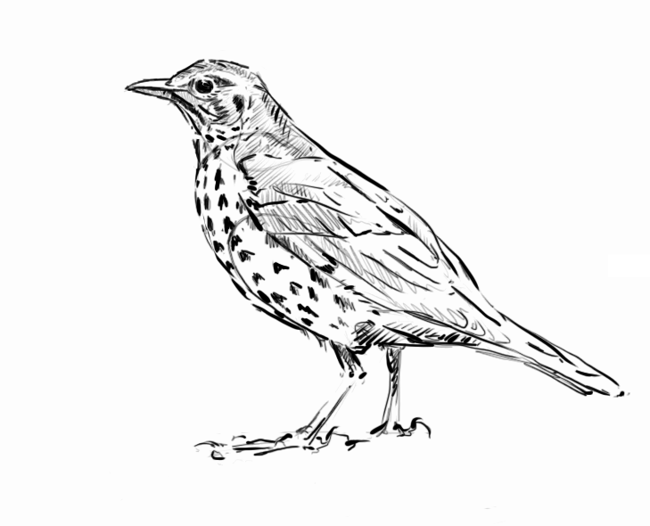 In a ten minute break from work, I found my hands wandering to the graphics tablet to produce this quick sketch of a song thrush – the heroes of the past few weeks. Perhaps I have never tuned in to them before, but it seems like they are super-abundant and very noisy at the moment.