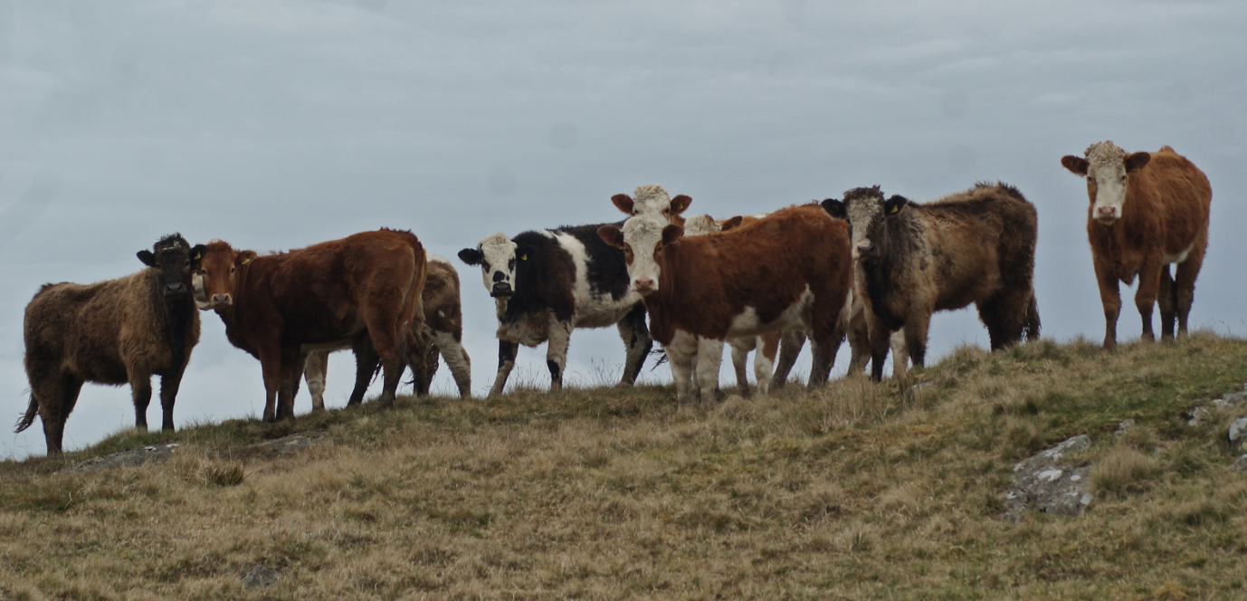 The cows came back ten days ago, but I hardly noticed them in the good weather. Through some barometric intelligence, they spend their days on the very highest ground during periods of clear, warm sunshine, and they are as effective as a German weather house when it comes to getting an accurate forecast. Up on the high tops, I see them sometimes through the binoculars as blocks of colour and shade, but since the cold fog came on, they have been down on the lowest part of the hill, and this has put them right under my nose.