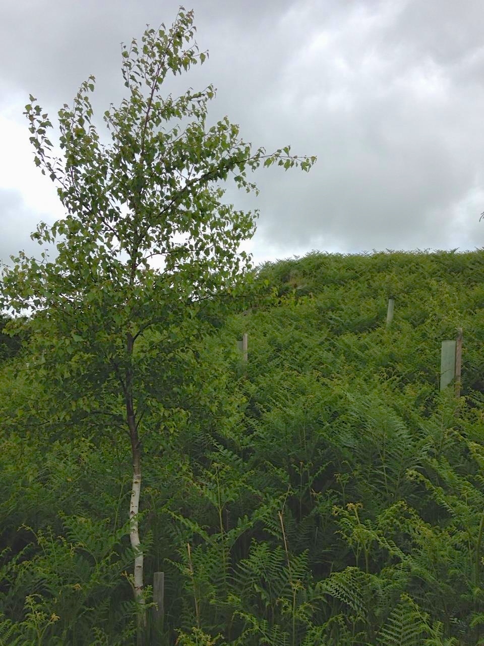 The tree guards have given the birches a protective start in life, but they have tended to mean that the trees have grown tall and spindly until they reach the bracken canopy, then bush out to catch the light (as in the photo above). By way of responding to this, I have removed the guards once the trees are tall enough to overlook the bracken canopy, and have been encouraged by the fact that the birches have started to shoot from further down. In time, I hope that these trees will suppress the bracken sufficiently to allow birch seedlings to establish, and while I imagine that there will always be bracken in this enclosure, I would be keen to see it in the context of a birchy little spinney.