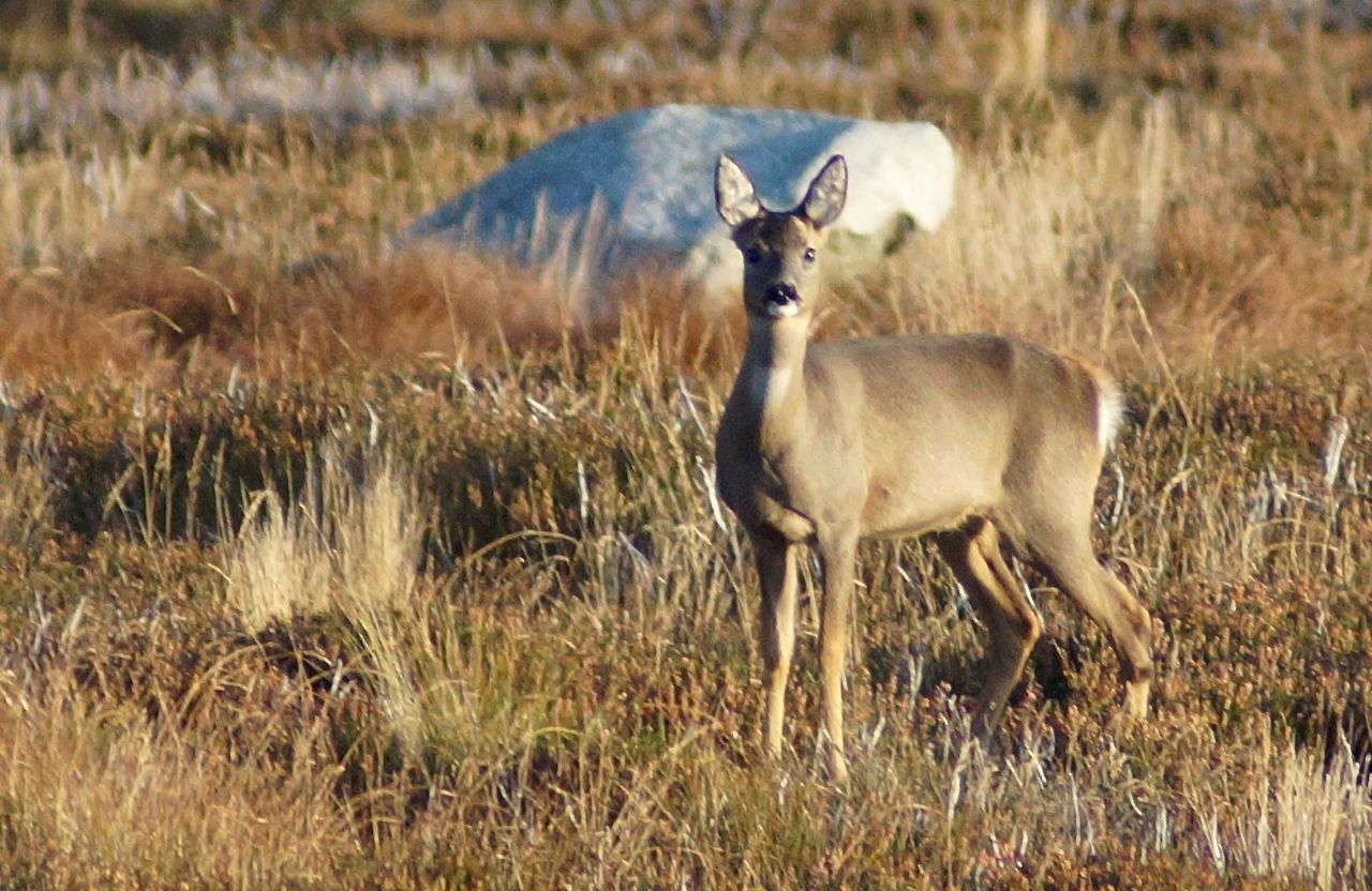 The slight breeze on the high ground was cooler, but hardly so as I could notice. A grouse or two rose up and buzzed away, and as the evening progressed, I stalked right in to a roe doe, now neat in her winter coat. She finally spotted me and stamped her foot, and I heard the dog’s tail wagging in the red grass behind me as she passed out of sight with half a dozen beautifully executed bounds.